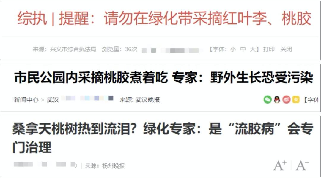 武汉市园林科学研究院植物保护研究所高级工程师董立坤在接受采访时表示,不建议食用这种流胶。第一,因为雨后湿冷,会有很多霉菌感染;第二,喷洒农药可能会污染园林养护。