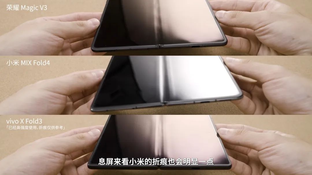 与其他几种机器放在一起,包括小米自己的上一代折叠屏,反光对比十分明显。
