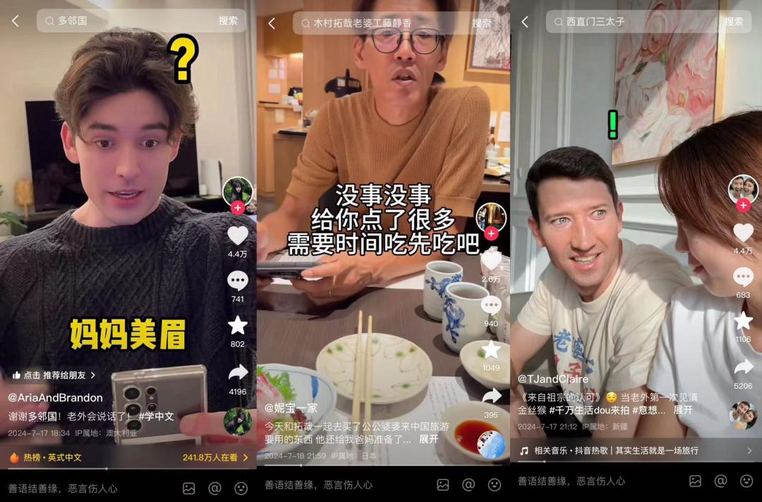 即使是没有特别呈现这部分内容的博主,也会被网友标准反向输出文化。例如,在@TJandClaire最近发布的视频中,男孩们展示了中文网络流行语。
