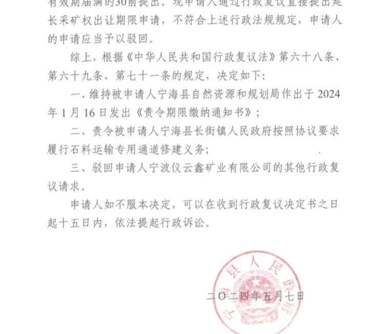 五月七日,宁海县政府作出行政复议决定,决定保留宁海县资产监督管理局作出的《责令期限缴纳通知书》;根据协议要求,勒令长街镇政府履行建设石材运输专用通道的责任;仪云鑫公司的其它行政复议请求被驳回。