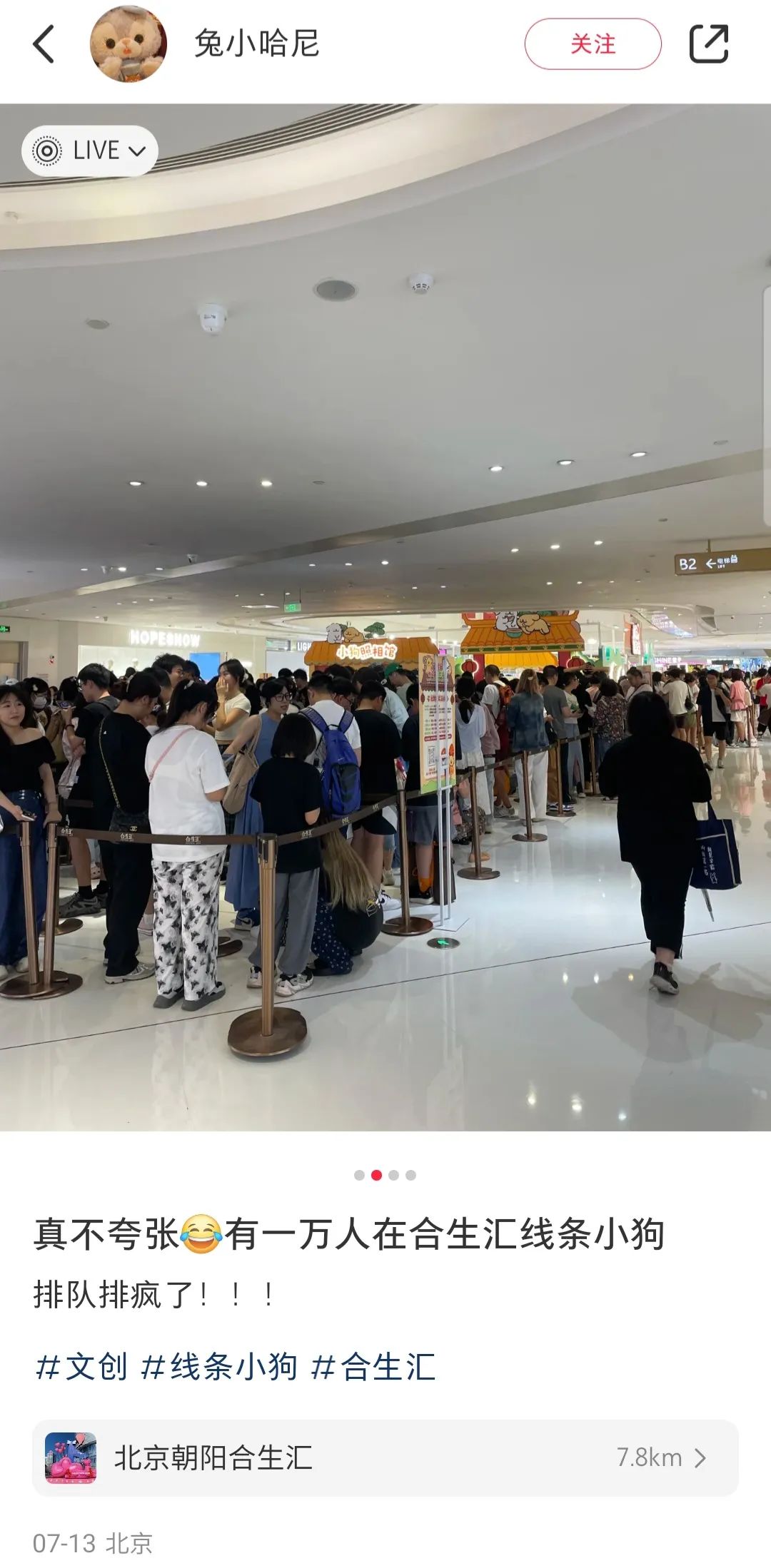 一些闪光活动,也成了年轻人的“诱捕器”。比如Chikawawa。、线条小狗等卡通形象的限时快闪活动,很容易让商场里有三四百人同时排队。即使要排队等两个小时,进去之后也只能限量购买,大家还是很开心。此外,一些针对年轻人的市场也很拥挤。