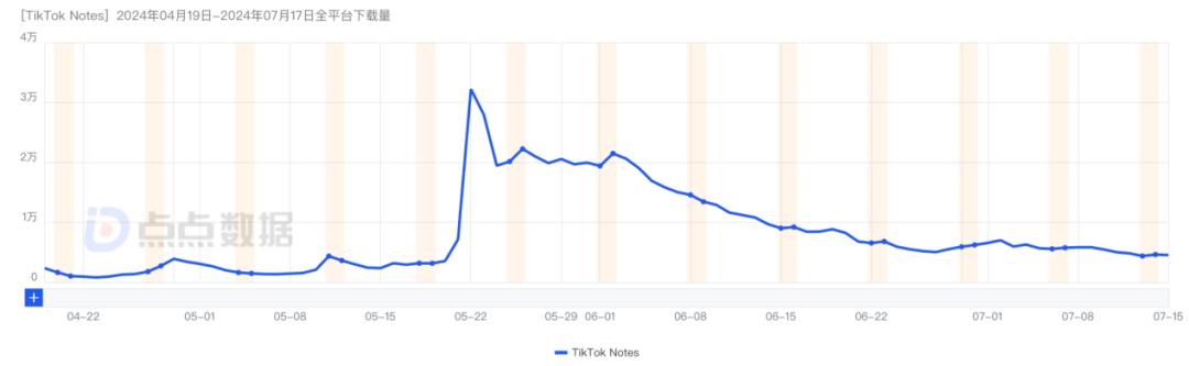 但是,尽管如此,TikTok Notes 自 5 月度达到高峰后,下载趋势呈下降曲线。据点点数据显示,自推出以来,TikTok Notes 累计获得了 71 下载一万多次。