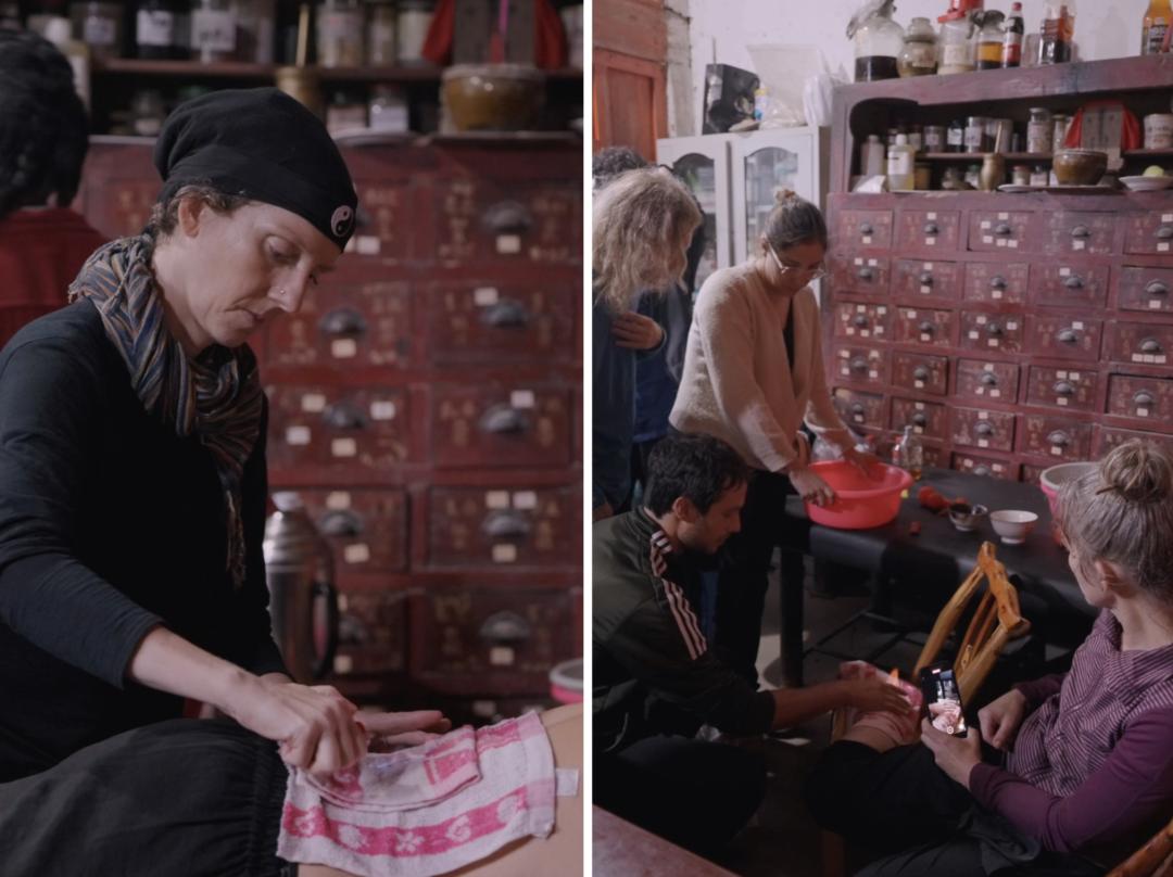 之后,在实践课上,他们会学习刮痧、针灸、艾灸、五音疗法、穴位、火疗、拔罐、认中药、挖药、制药、熬药、服药等等。