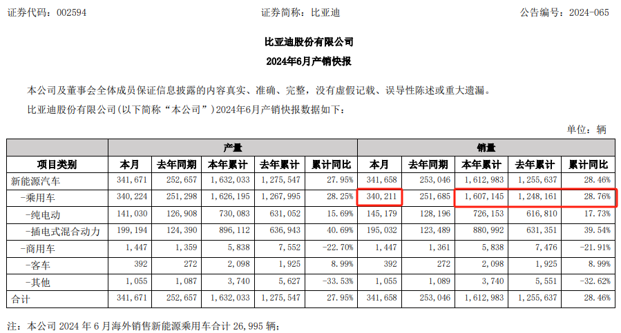 比亚迪上半年新能源乘用车销量达到160.71万辆,比去年同期增长28.76%,其中海外销量超过20.3万辆,比去年同期增长173.8%。
