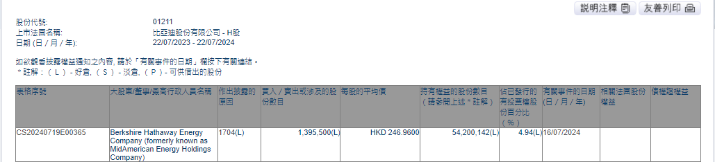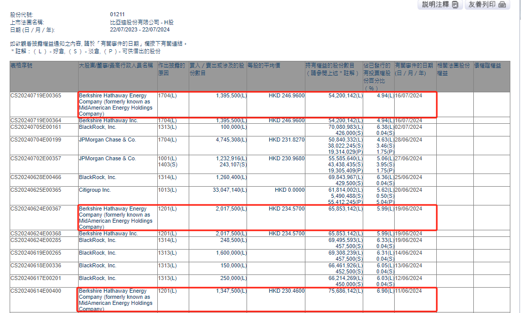 根据港交所的数据,伯克希尔在2024年6月11日和6月19日减持了134.75万股比亚迪H股和201.75万股。