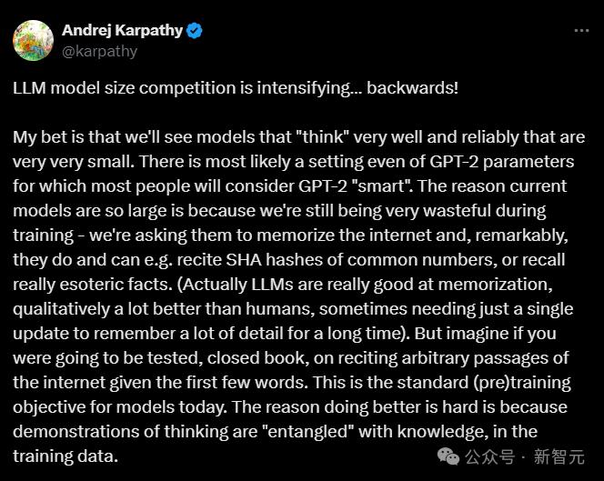 Karpathy认为,如果有更高质量的训练数据集,完全可以训练出一个规模更小、能力更强、推理能力更强的模型。