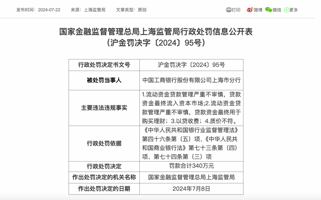 根据行政处罚信息公示表,近日,中国工商银行上海分行因四项违规行为被中国金融监督管理局上海监管局罚款340万元。