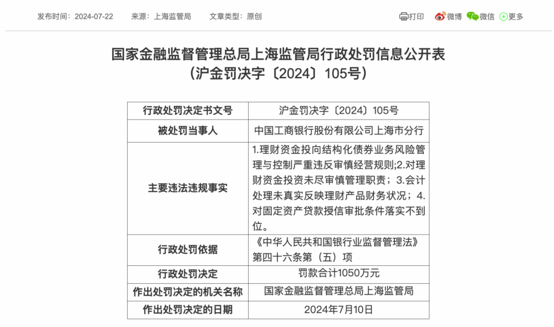7月10日,上海工商银行分行被上海监管局罚款1050万元。主要违法违规事实包括:金融资金投资结构化债券业务风险控制和控制严重违反审慎经营规则;未履行对金融资金投资的谨慎职责;会计处理并没有真正反映金融产品的财务状况;固定资产贷款信用审批条件落实不到位。