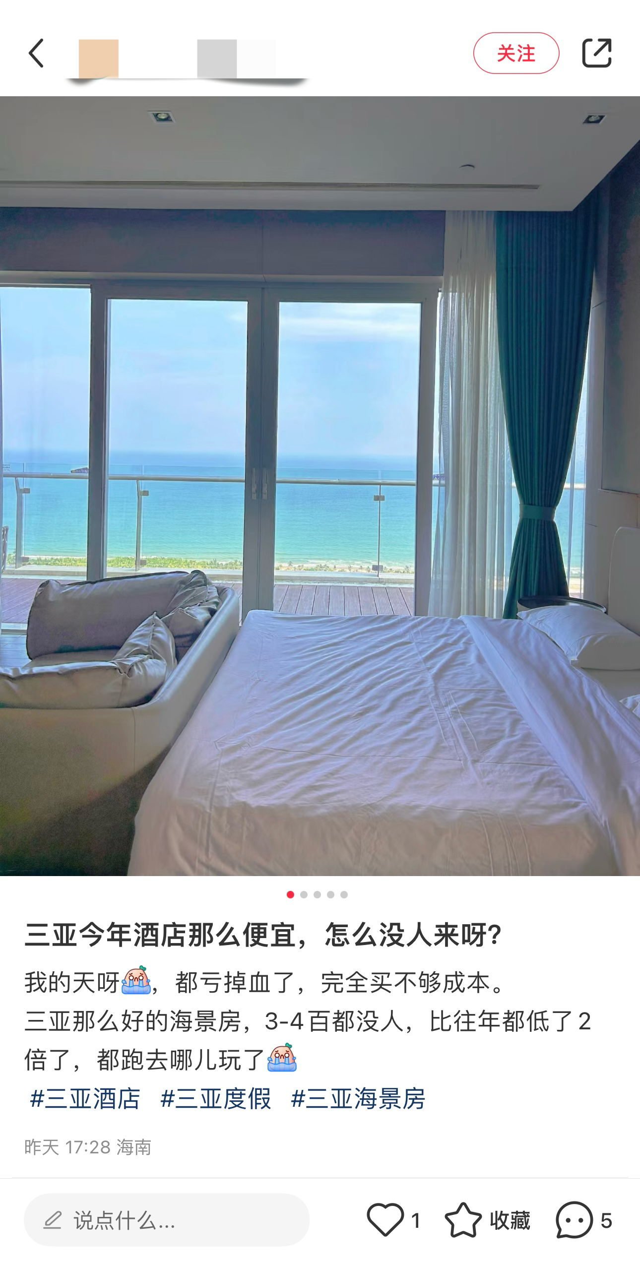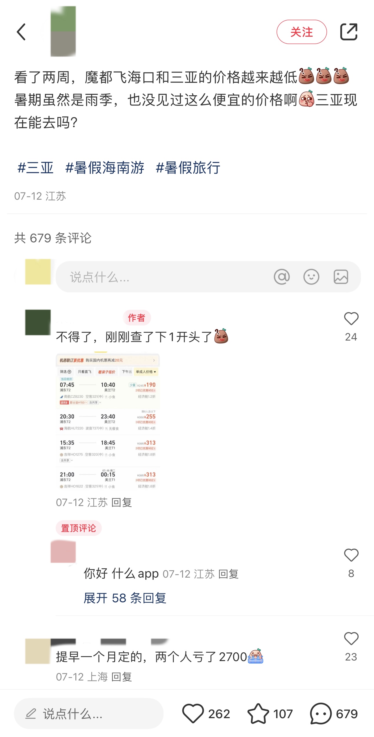 除游轮外,前几年热门的“三亚游”今年夏天的价格也便宜不少。有网友表示,提前一个月订票两人亏损2700元。