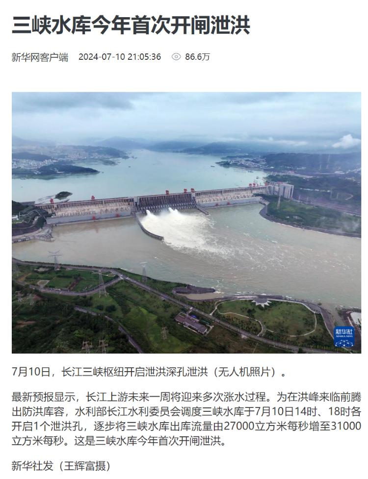 据新华社10日报道,7月份,在预计长江上游将迎来多次涨水的前提下,水利部长江水利委员会于7月10日14:00和18:00调度三峡水库开启一个泄洪孔,逐步将三峡水库的出库流量从每秒27000立方米增加到每秒31000立方米。