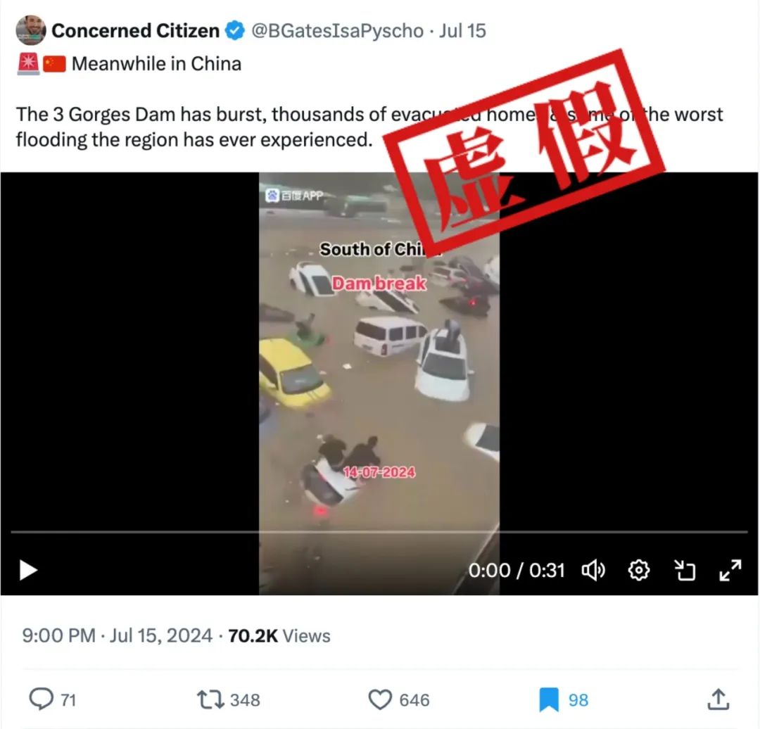 近日,X平台(原推特)上有传言称,涉嫌中国三峡大坝全部倒塌,造成1975年以来最严重的洪水。相关声明还附有一段视频,持续了大约30秒。据报道,“三峡大坝决堤导致成千上万家庭被迫撤离”。
