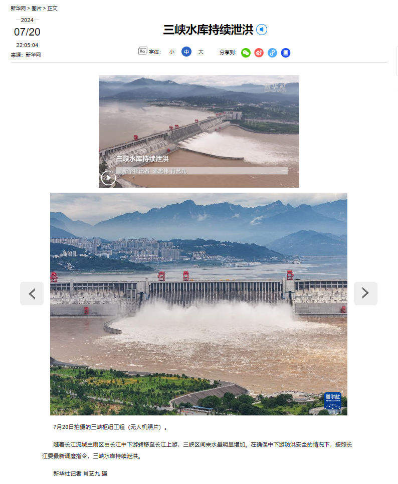 据新华社记者报道,随着长江流域主要雨区从长江中下游转移到长江上游,三峡区间来水量明显增加。在保证中下游防洪安全的前提下,根据长江委员会最新调度指令,三峡水库继续泄洪。新华社发布的几张无人机照片显示,三峡大坝正常泄洪,没有坍塌。