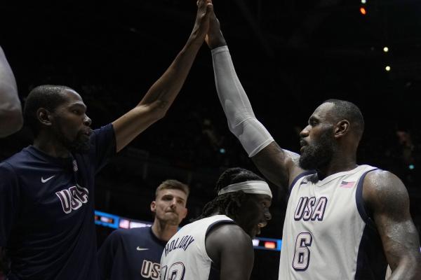 2024年7月22日,英国伦敦,2024年男篮热身赛,詹姆斯(右)带领美国92-88击败德国。