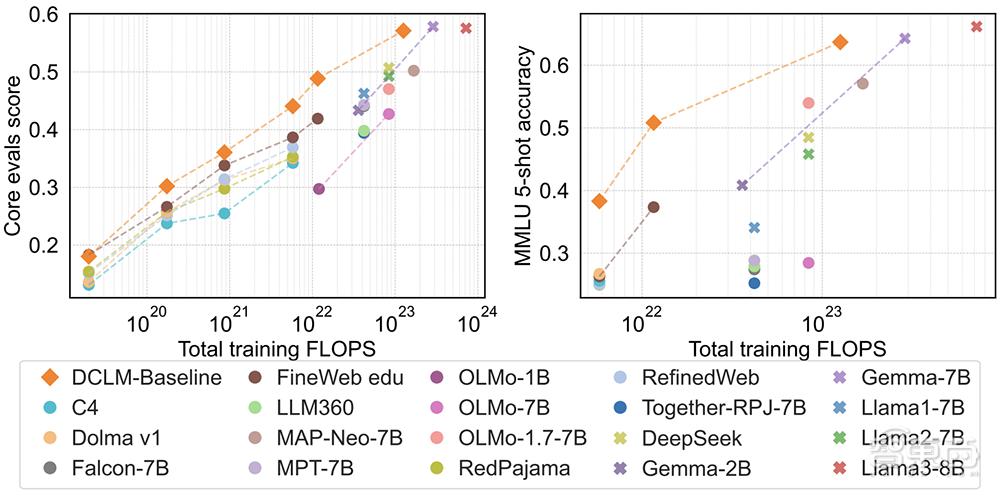 ▲与闭源模型(叉)和其他开源数据集和模型(圆圈)相比,苹果的DCLM-Baseline训练模型显示出良好的性能。