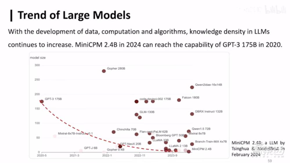模型能力÷参与模型参数=知识密度,这一衡量层次可以用来代表相同的参数规模模型,并且具有很强的智能性。GPT-3模型于2020年6月发布,参数达到1750亿次。今年二月, 面壁智能MiniCPM-2.4B模型具有相同的特性,参数规模已降至24亿,相当于提高了知识密度。86倍。