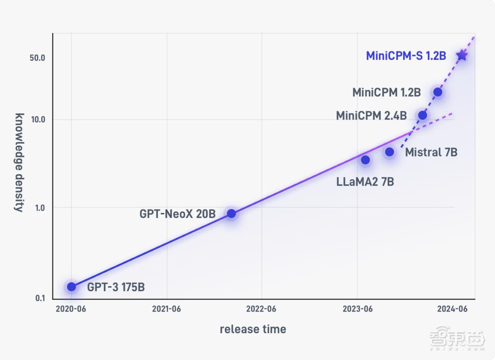 该企业还通过高效的稀疏架构完成了更高的MiniCPM能效。-S 1.2B模型:MiniCPMMiniCPM,知识密度达到相同规模。 2.57倍,1.2B,Mistral-7B的12.1倍,进一步诠释了“面壁定律”,大大降低了大模型推理的成本。