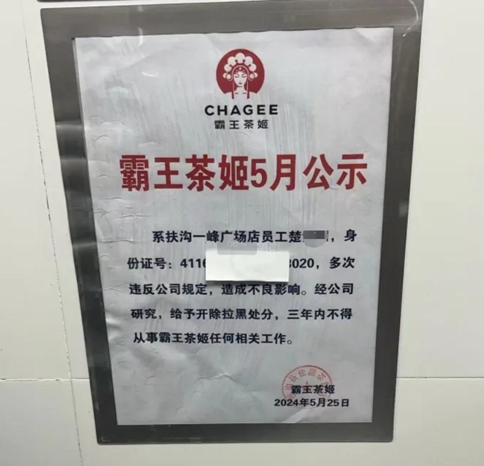 第二件事,河南周口一女孩在社交平台上发文称,在正常离职流程结束后,她的姓名和身份证号码被霸王茶姬“广泛宣传”,并被描述为“多次违规,造成不良影响。开除黑化处分,三年内不得从事霸王茶姬任何工作。”