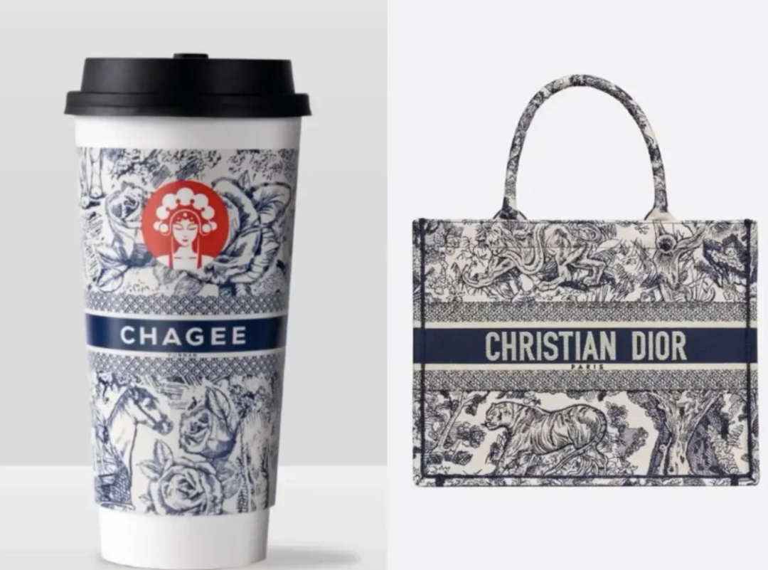 事实上,除了效仿现代中国茶叶店的市场定位之外,霸王茶姬的设计风格也经常碰到国际一线品牌。比如2022年,霸王茶姬的新包装设计和迪奥去年推出的布景 Tote手袋动物丛林系列高度相似,两者都是白色背景上的蓝色印花,印花图案都是动植物,中间有一条“腰带”,上面写着品牌名称。