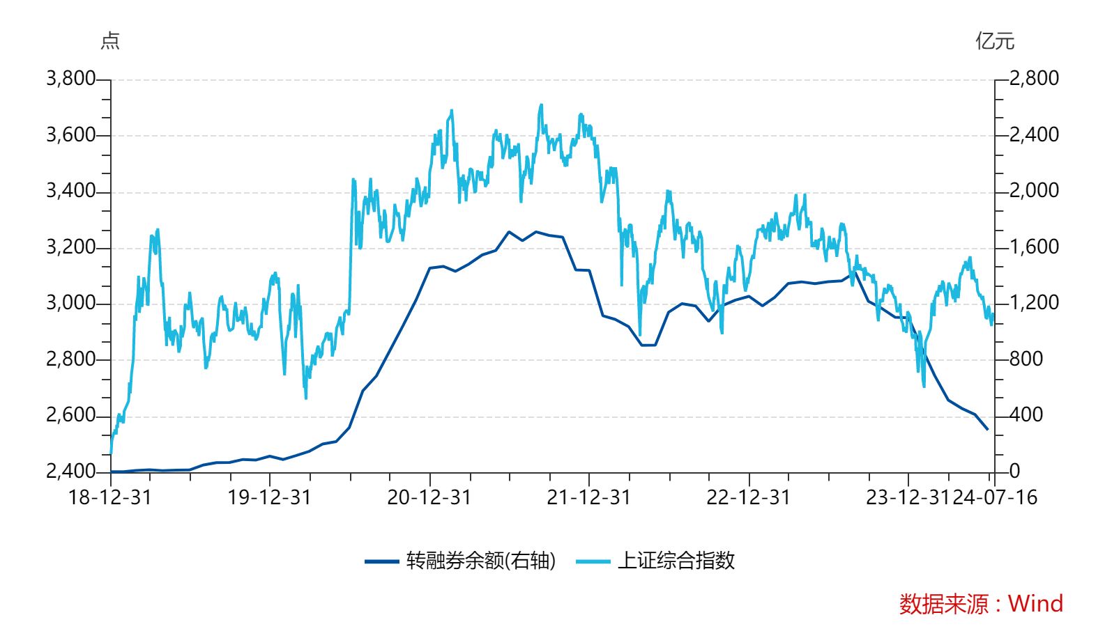 2024年7月10日,证监会依法批准中证金融公司暂停转融券业务的申请,自2024年7月11日起实施。交易所也将融券保证金比例由不得低于80%上调至100%,私募证券投资基金参与融券的保证金比例由不得低于100%上调至120%。业务调整后预计转融券的规模会进一步回落。背后核心在于近1年来市场均处于震荡调整的环境中,广大投资者对市场企稳转好有着明显期待,也对稳定市场的监管政策有诉求,而当前暂停转融券等业务的变化,即为监管层重视投资者关切,强化逆周期调整的积极行动,有望稳定投资者信心,助力市场的稳步修复。