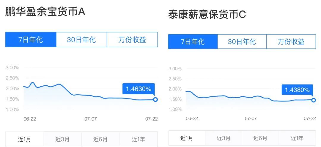 事实上,不仅天弘余额宝的货币基金产品收益持续下降,其他门槛低、流动性高的“婴儿”产品也是如此。比如在余额宝中可以选择的另外两个货基,鹏华盈利宝货币A和泰康薪意保货币C,最近一个月的7天年化收益都从“2”字头下降到了1.4%。