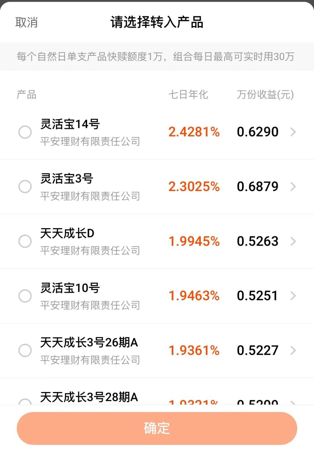 比如“灵活宝”,其底层资产主要是平安理财旗下的“天天成长”现金管理商品,目前已有30种。截至7月23日,这些产品的年化收益为1.8337%~万份收入在2.4281%之间,0.5003~0.6290之间。