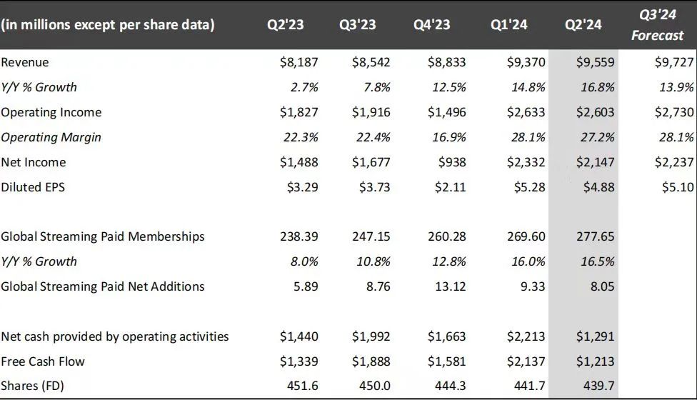 Netflix于7月18日发布了截至今年6月30日的第二季度财务报告。Netflix在给投资者的信中表示,当季总收入为95.59亿美元,同比增长16.8%(去除汇率影响为22%),也高于之前财务报告中预期的94.91亿美元。Netflix的净利润为21.47亿美元,同样优于20.63亿美元。