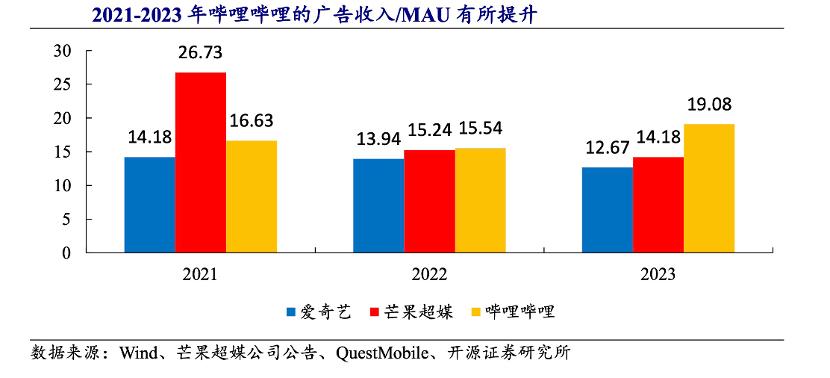 短片推动了客户总时间,又开启了新的广告存量,平台广告实现效率不断提高,2023年哔哩哔哩广告ARPU已大大超越爱奇艺和芒果超媒体,2024年Q1广告收入达到16.69亿元,同比增长31%。
