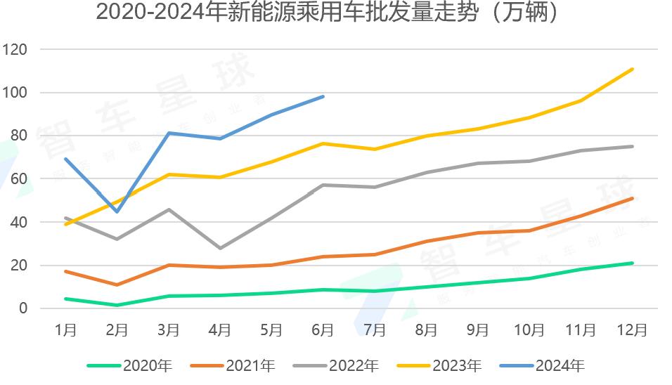 六月份新能源乘用车市场总批发销售额达98.2万辆,比去年同期增长29%,比去年同期增长9%。