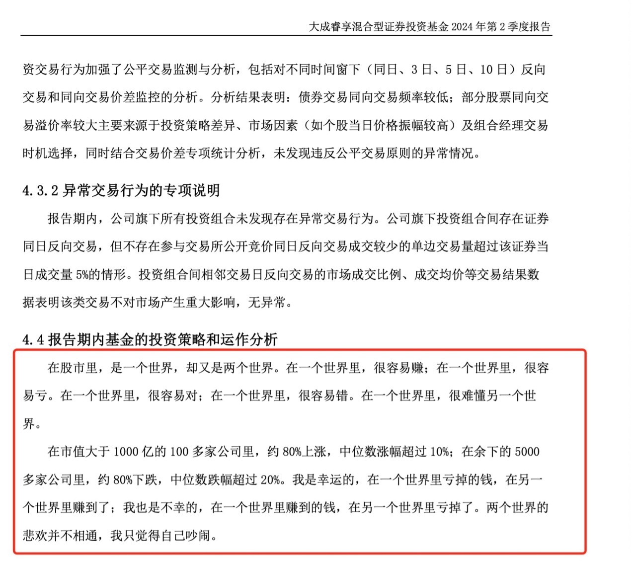 从年初的“百年孤独”风格到第二季度报告的“两个世界”理论,徐彦的分享字数少了一大半,今年只有两个段落。从人类的喜怒哀乐来看,有两种完全不同的心态:在市场上赚钱和不赚钱。