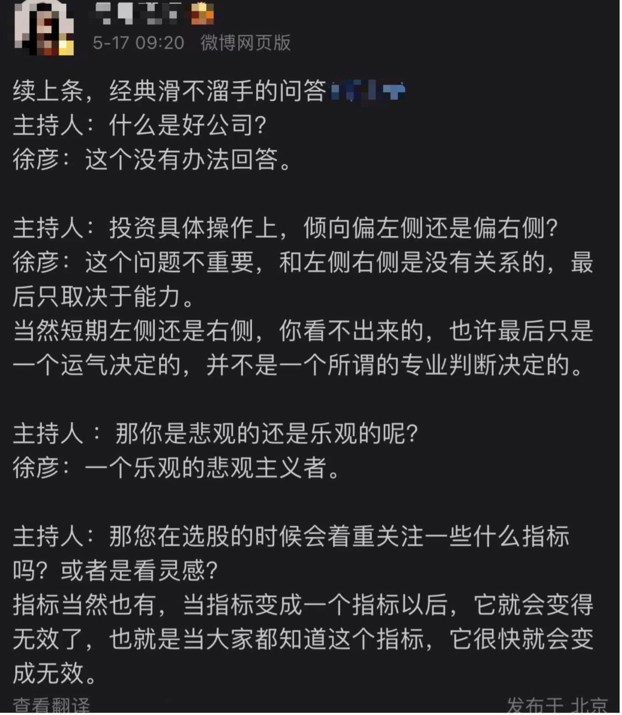 除了季报短文,徐彦之前也被称为“滑不留手”的受访者。在一次采访中,主持人问他什么是好公司。他说:没有办法回答这个问题。主持人又问他:操作是左还是右?他说:没关系。再问选股指标,他的回答是:当然有指标,但是当指标变成指标的时候就无效了。