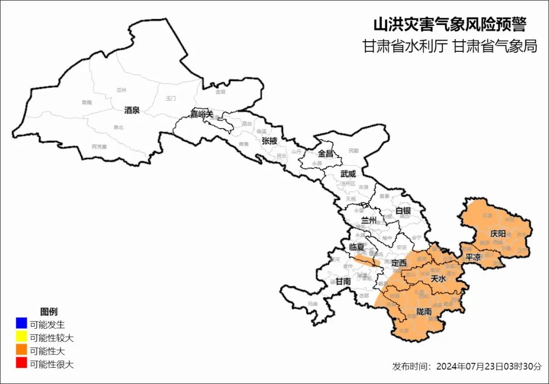 2024年7月23日03时,甘肃省水利厅、甘肃省气象局联合发布山洪灾害气候风险橙色预警:预计07月23日03时至07月24日20时,我省平凉、庆阳、天水、陇南、定西东部、甘南东部、临夏太子山沿线有暴雨或暴雨,累计降雨量100-140mm,最大可达200-300mm。23日03时至23日20时,平凉市(泾川县、崇信县、灵台县)、庆阳市(镇原县、西峰区、宁县、正宁县、合水县)、定西市(通渭县)有大雨;平凉市(静宁县、庄浪县、华亭市)、庆阳市(环县、华池县、庆城县)、天水市(张家川县、清水县、秦安县、甘谷县、武山县)、定西市(陇西县、漳县、兖县)、临夏州(和政县、康乐县)、甘南州(合作市、临潭县、卓尼县、迭部县、舟曲县)暴雨。23日20时至24日20时,陇南市(西和县、成县、徽县、两当县、康县、文县、武都区)、天水市(张家川县、清水县、麦积区、秦州区)、平凉市(华亭市、崇信县、灵台县、泾川县)、有暴雨的庆阳市(镇原县、西峰区、庆城县、合水县、华池县、宁县、正宁县)。23日20时至24日20时,陇南市(西和县、成县、徽县、两当县、康县、文县、武都区)、天水市(张家川县、清水县、麦积区、秦州区)、平凉市(华亭市、崇信县、灵台县、泾川县)、庆阳市(镇原县、西峰区、庆城县、合水县、华池县、宁县、正宁县)暴雨。山洪灾害可能发生在上述地区(橙色警告)。其他地区也可能因短历时强降水造成山洪灾害。请注意实时监测、防洪预警、危险区域人员转移、规避风险等防范工作。,公众应注意防灾和规避风险。