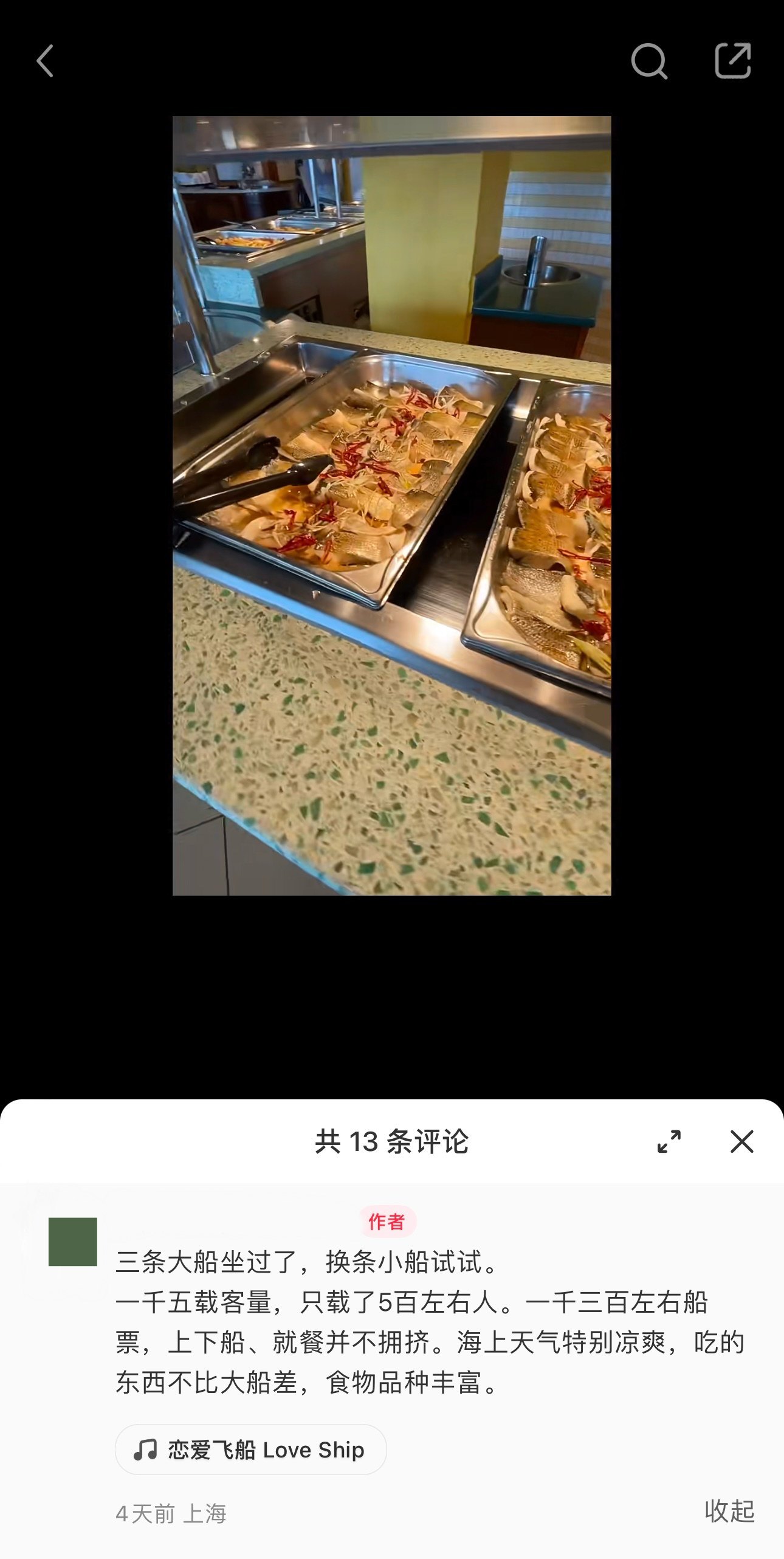 他说:“我坐过很多次游轮,基本上疫情前从上海出发的游轮都坐过。“带着一个大家庭,其中一个2岁以下的宝宝在旅行,李女士告诉《ThePaper》,今年7月初坐的游轮是在社交平台上买的“尾单”。“我买了一个8天7夜航行的海景房,人均2650元。因为这次航行的次数特别少,我们登船后升到了阳台房。升级的价格是500元一个人,最后一次航行的价格只有3150元/人。”