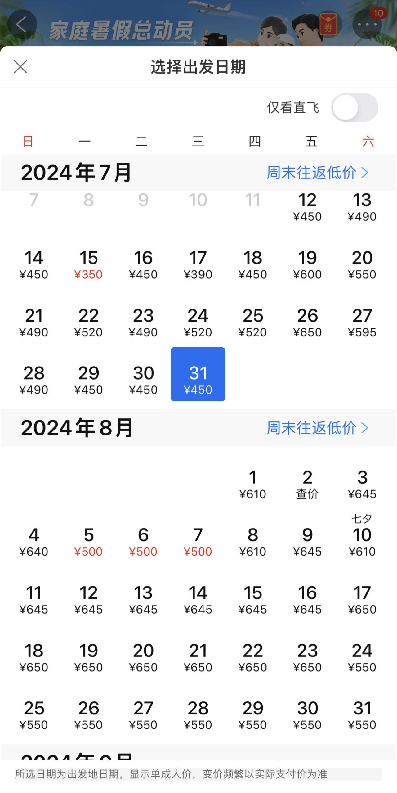 根据7月初查询的价格,单程机票的最低价格只有350元。