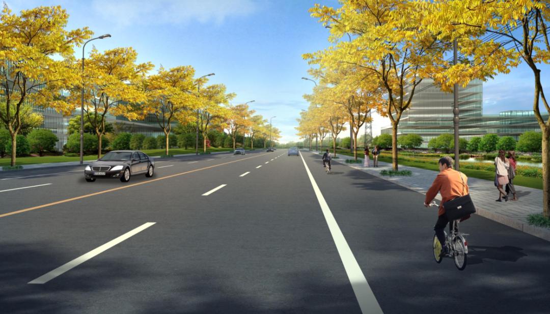 路面按照城市支路标准设计,全长约680米,标准红线宽27米,行驶速度30公里/小时。采用双向四车道,车道路面采用沥青混合材料。配套建设电力、通信等管道和路灯照明、绿树、交通安全标志等附属工程。