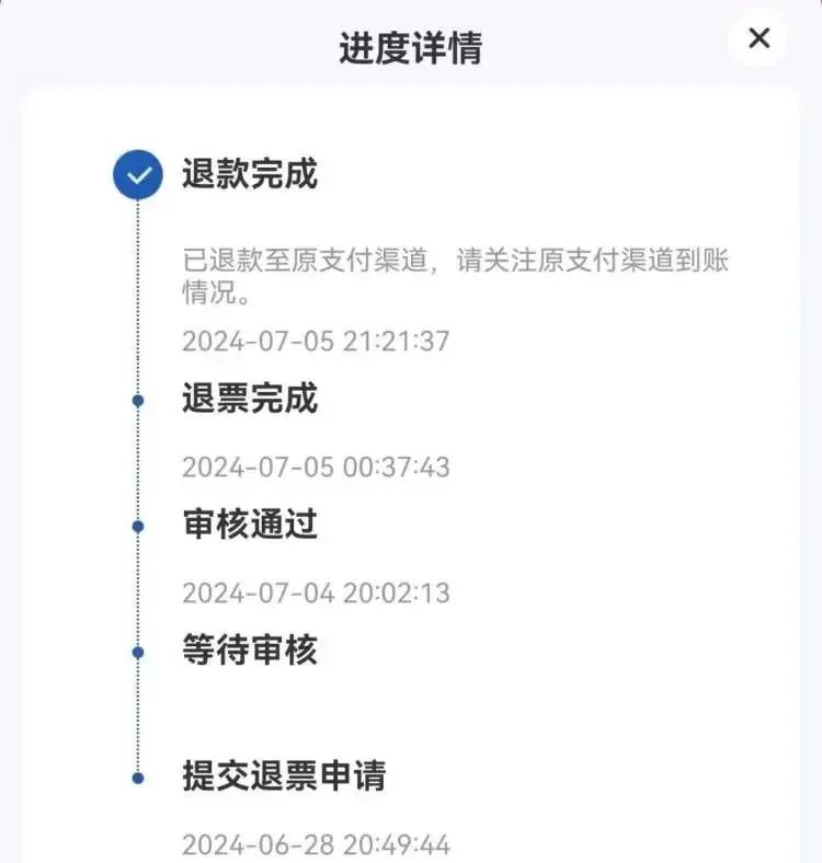 买了之后,她取消了高价订单的值机。6月28日,行程结束回家一天后,她给东航打了电话。“早上给东航打了电话,下午回电,让我先在App申请,写个工单号。说审批也需要时间,先提交申请。7月4日,审批通过,7月5日钱到。虽然审批时间很长,但还是很快到达。”