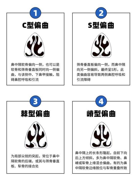 根据骨偏曲的形态,鼻中隔偏曲可分为四种不同类型: