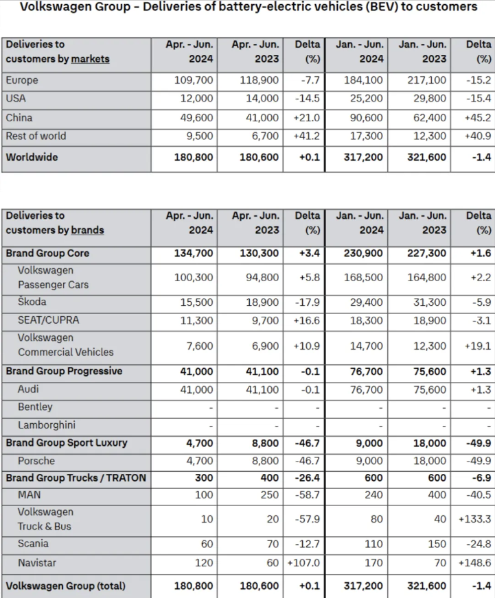 据大众集团提供的数据显示,上半年,大众集团在全球范围内销售了31.72万辆电瓶车,比去年同期下降了1.4%。在这些市场中,占销售额60%以上的欧洲市场大幅下滑15.2%至18.41万辆;美国市场需求同样疲软,下降15.4%至2.52万辆;尽管中国市场上涨了45.2%,但规模仍然只有欧洲的一半,9.06万辆。