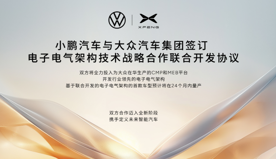 2024年2月,小鹏汽车和大众汽车围绕平台与软件战略技术签署联合开发协议,并就车型和平台的共同零部件签署联合采购计划。2024年4月,小鹏汽车与大众汽车发布联合声明,双方签署了基于小鹏汽车最新一代EEA架构联合开发新电子电气架构平台的最新战略合作框架协议,预计将于2026年起应用于中国制造的大众汽车品牌电动汽车。