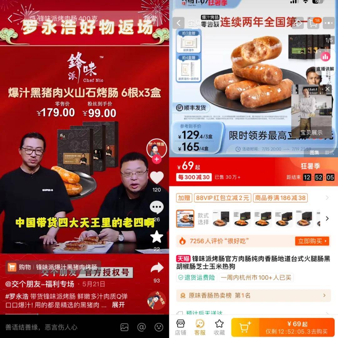 当然,自营品牌作为超头的新增长曲线也有例子。2021年,谦寻与谢霆锋联合创立了“丰味派”。在接下来的几年里,丰味派从直播间进入了Tiktok、天猫、JD.COM等主流电商,甚至进入了盒马、大润发等线下超市。根据欧瑞商务咨询调查的数据,丰味派的爆款“爆汁香肠”零售额连续两年位居全国第一。谦寻有成功交易品牌的经验,他的翅膀更丰满。