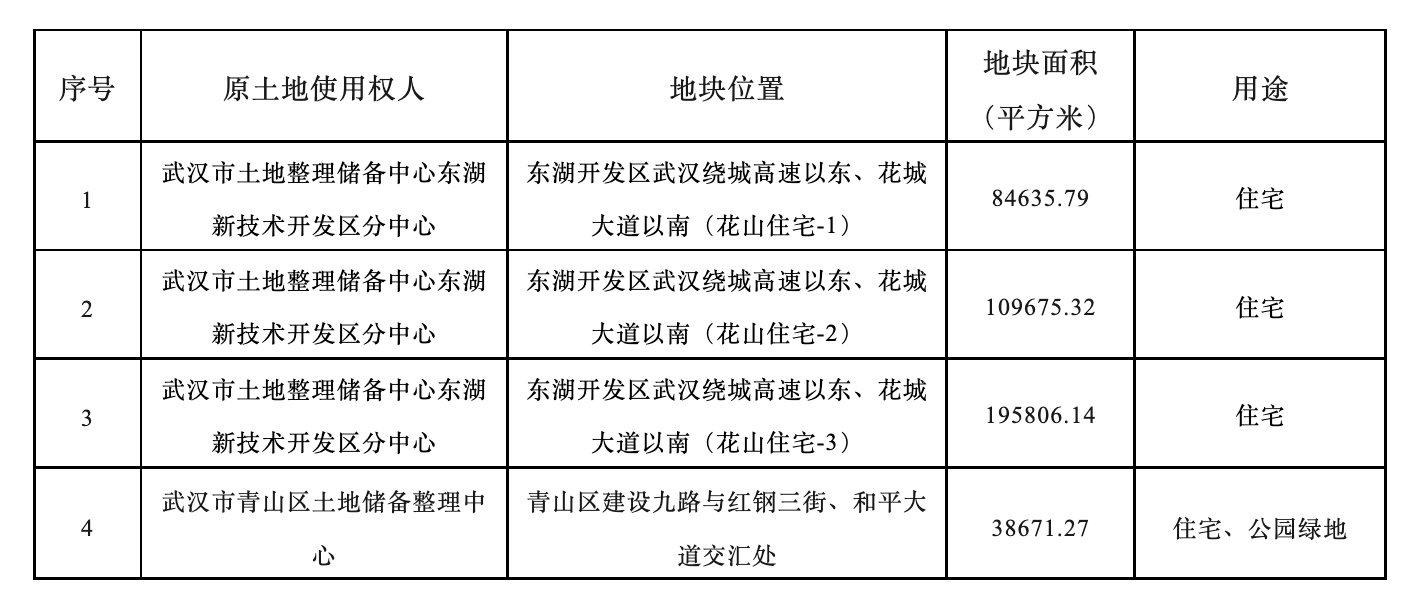 其中,东湖开发区武汉绕城高速东侧、花城大道以南(花山住宅-1)地块面积84635.79平方米;东湖开发区武汉绕城高速东侧、花城大道以南(花山住宅-2)地块面积109675.32平方米;东湖开发区武汉绕城高速东侧、花城大道以南(花山住宅-3)地块面积195806.14平方米;青山建设九路与红钢三街、和平大道交汇处地块38671.27平方米。