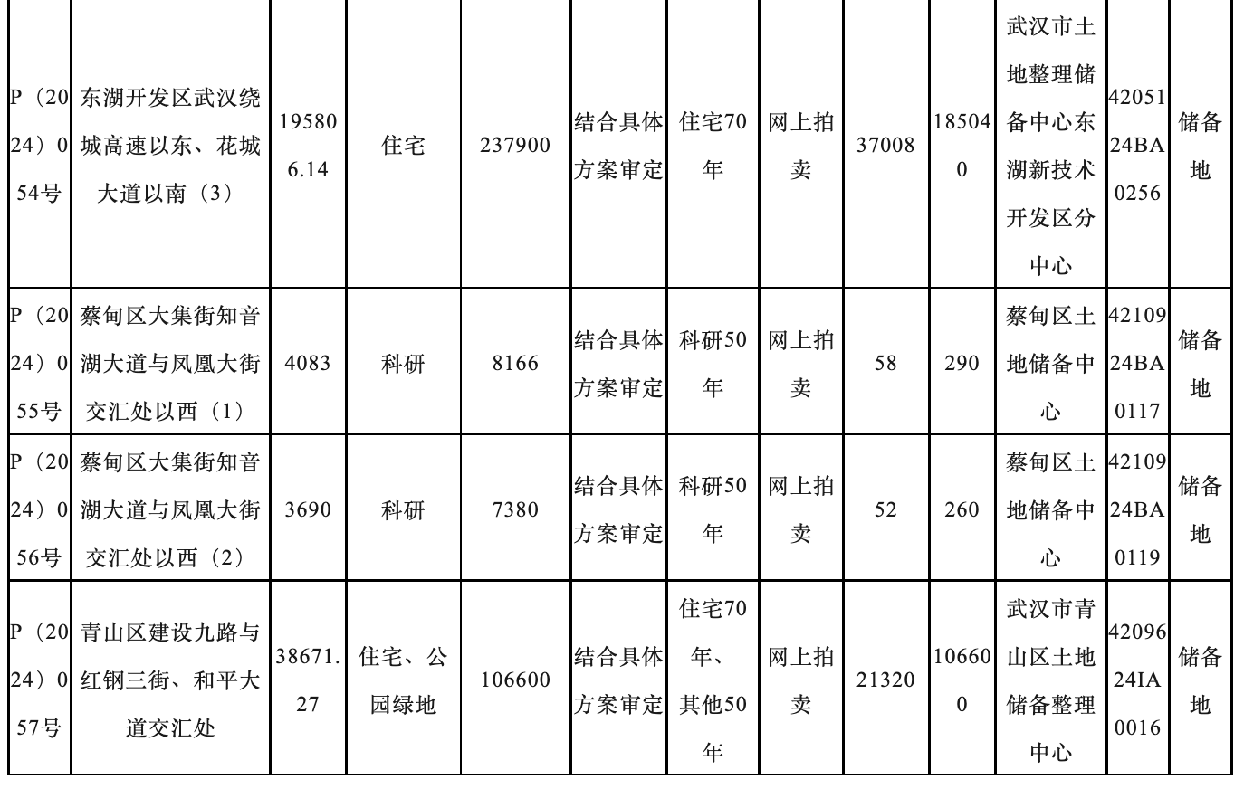 同日,武汉市自然资源和城乡建设局发布国有建设用地使用权公告,决定以拍卖方式转让8块地,2024年8月13日地块网上拍卖。