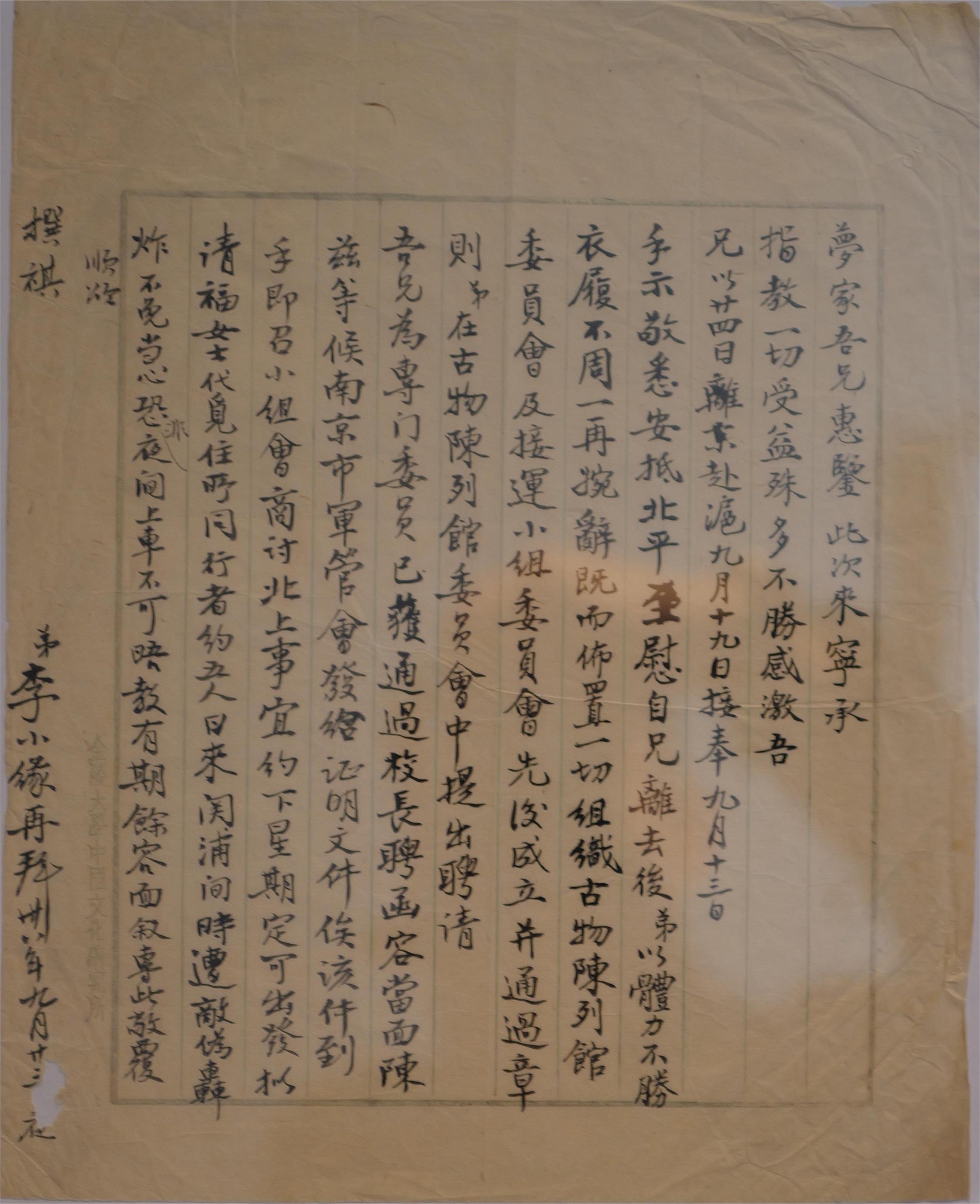 这次来宁承指教一切,受益匪浅,不胜感激。兄弟二十四日离京赴沪,九月十九日接奉九月十三日手示,敬悉安抵北平,至慰。自哥离开后,弟弟以体力不足,衣履不周,一次又一次婉辞,既布局了一切。组织古物展览馆委员会和运输小组委员会成立并通过规则。弟弟在古物展览馆委员会指出,我哥是特别委员,已经通过,校长的聘函可以面对面展示。等南京市军事管理委员会发出证明材料,该件到手,即召集小组协商北进事宜。约下周可以出发,拟请福妇女代寻住所,同行约5人。日来关浦间时遭到敌伪轰炸,不禁小心,恐非夜间上车不可。见教有期,余容面叙。这里,敬复。