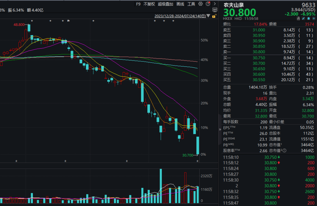 市值超过3000亿港元的农夫山泉股价再次“下跌”