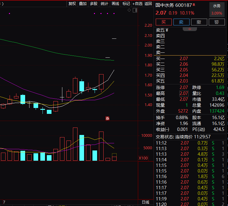 今日上午,国中水务再一次一字涨停,该股已连续三个涨停。新闻方面,该公司计划控制“汇源果汁”的母公司。
