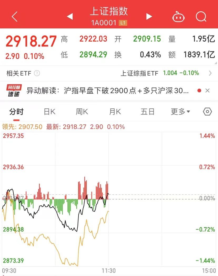在震荡的a股市场,上证指数一度跌破2900点整数关口,然后收盘价V。上午收盘指数站在2900点以上,红盘收盘。