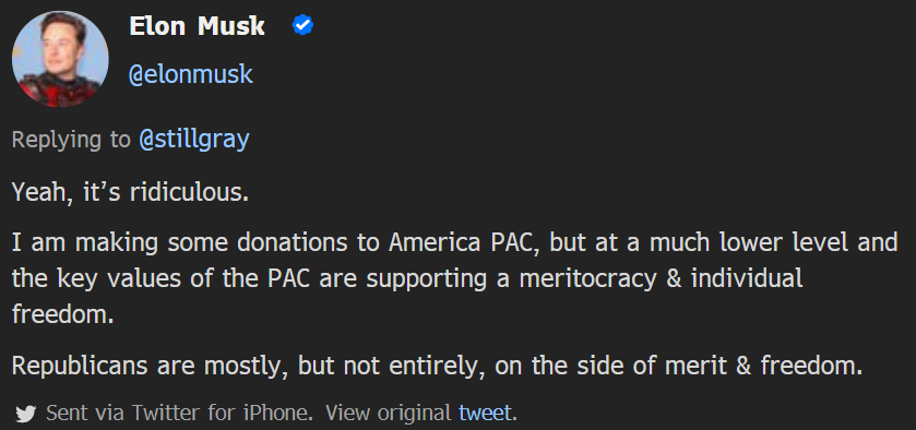 此前有报道称,特斯拉首席执行官马斯克承诺每月向该组织捐赠4500万美元。他曾经用一个表情符号——“FAKE GNUS”,回应《华尔街日报》,他向America回应。 报告了PAC捐款金额。