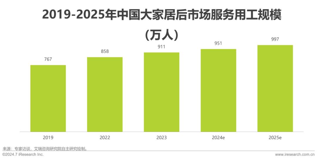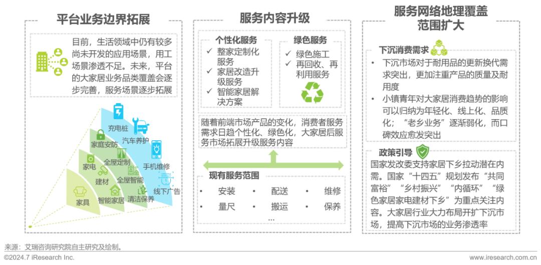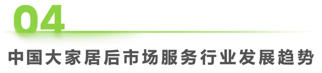 随着新一代客户的兴起,新的消费观念进一步推动了行业的创新变革,我们进入了一个新的家庭消费时代。产业链后服务市场作为家庭零售的重要组成部分,以消费者为中心,延伸产品类别和服务业态。1)后市场服务场景不断扩大,服务平台拓展业务界限。二是因特网消费需求升级,售后服务需求日益个性化,大家居售后服务平台拓展升级服务内容。例如:全家定制服务,家居改造升级服务,智能家居解决方案等。另外,随着消费者环保意识的提高,绿色可持续发展将成为大家居后市场服务平台的重要方向。3)随着下沉市场消费者需求的升级,开拓市场新领域,后服务市场扩大了服务体系的地理覆盖面,提高了市场的业务渗透率,覆盖了更多的家庭。