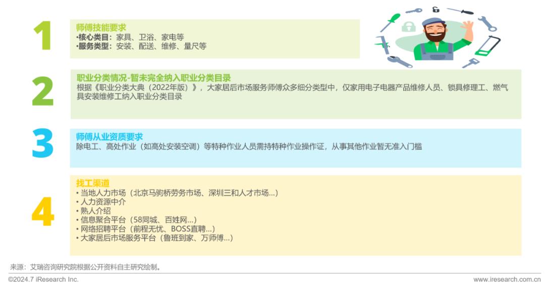大家居后市场服务市场规模的持续增长促进了就业规模的扩大。艾瑞估计,2023年,大家居后市场服务就业规模将达到911万人。根据核心家居产品类别和服务项目,后市场服务大师包括很多细分类型,但除了家用电器产品维修、锁具维修、燃气器具安装维修外,其他工种尚未列入职业分类目录,相应的国家职业技能标准也存在不足;从师傅的求职渠道来看,线下门店包括区域劳务市场、人力资源中介、熟人介绍等。在线渠道包括信息聚合平台、在线招聘平台和大家居后市场服务平台。