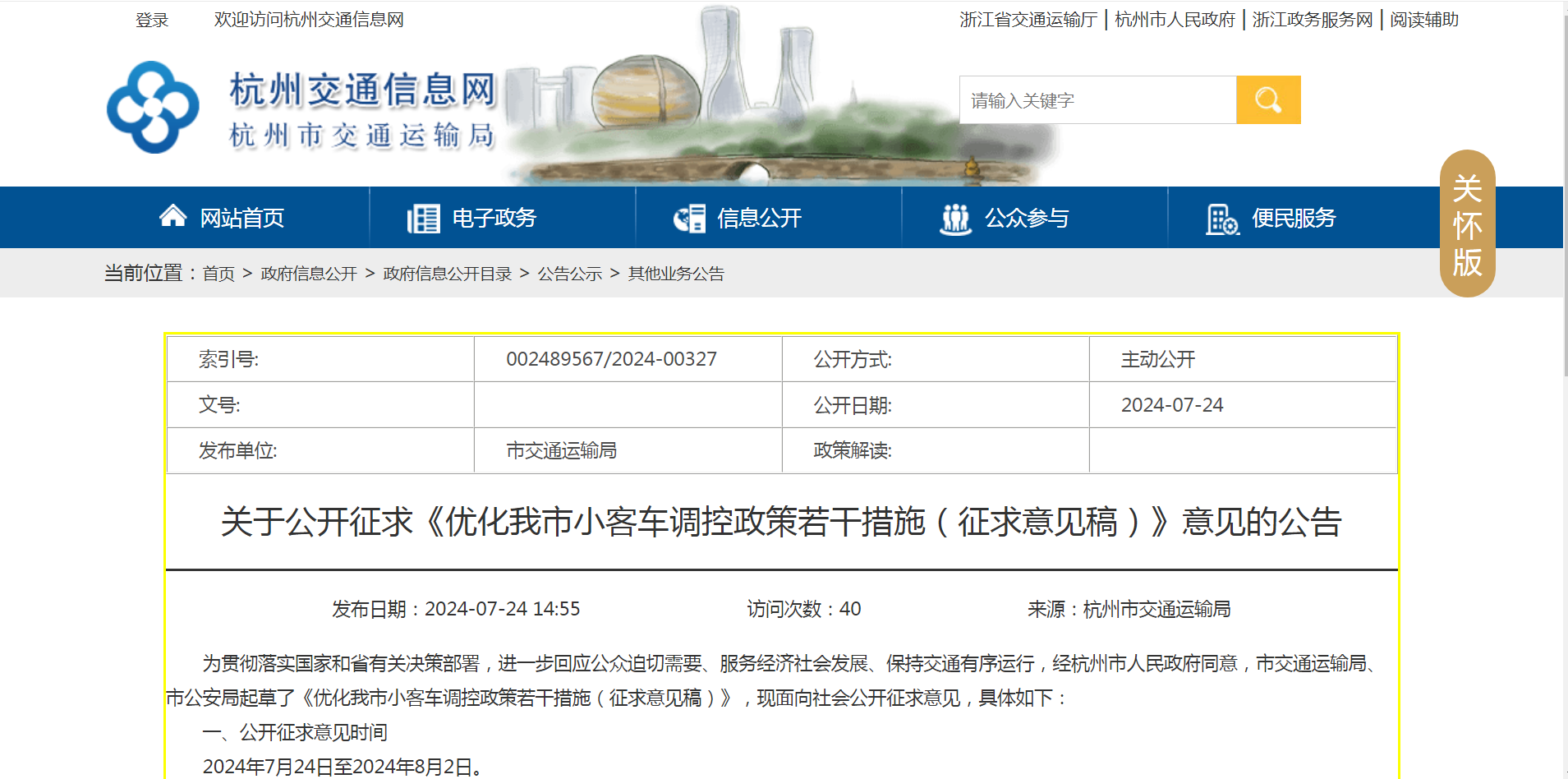 7月24日,杭州市人民政府门户网站发布消息,公开征求《关于提高杭州市乘用车调控政策若干措施(征求意见稿)》意见的通知。提到个人和单位申请区域指标的资格和数量限制被取消。