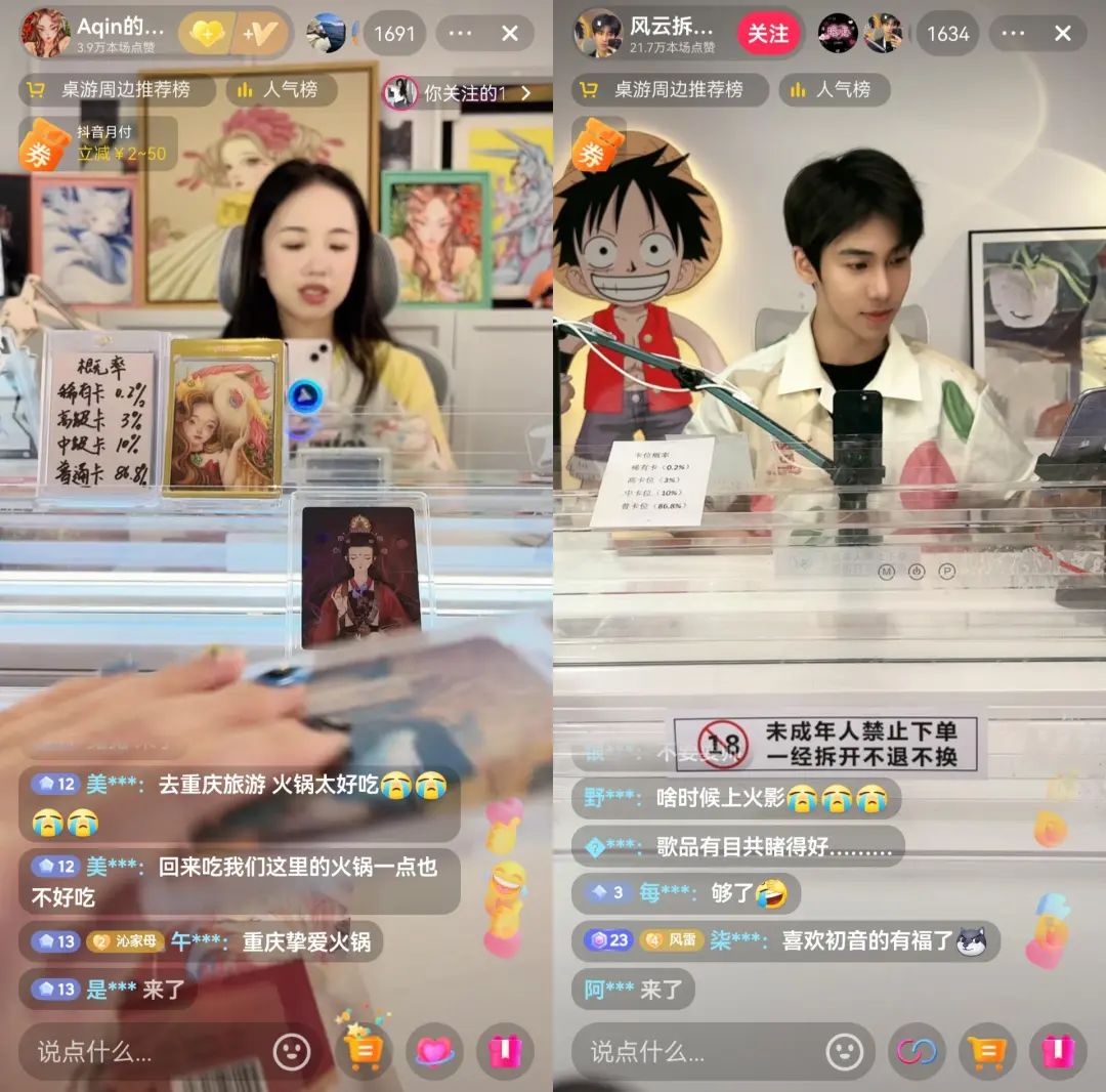 卡片俘获了年轻人和女性,拆卡直播间的流量和收益也逐渐激增。据《虎嗅》报道,一位消费者表示,抖音直播拆卡行业流量从2020年2亿元上升至2023年上半年30亿元。